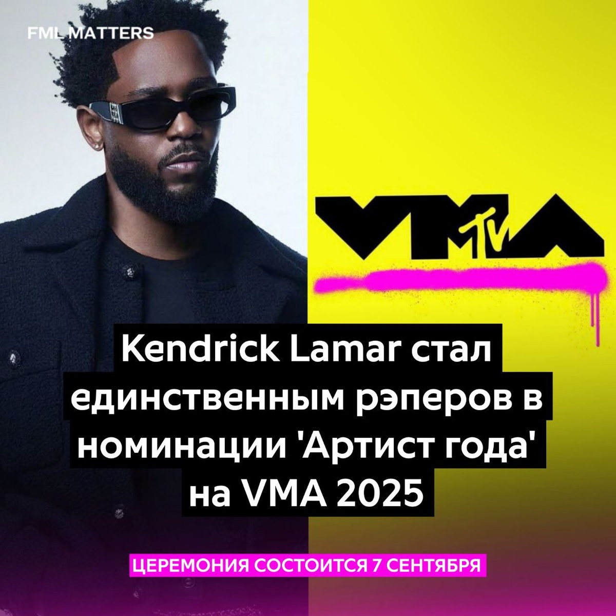 ⚡️ KENDRICK LAMAR НОМИНИРОВАН «АРТИСТОМ ГОДА» НА «VMA 2025»! Он стал единственным рэпером, попавшим в этот престижный список в этом году. Среди других номинантов: ➖ Bad Bunny ➖ Beyoncé ➖ Lady Gaga ➖ Morgan Wallen ➖ Taylor Swift ➖ The Weeknd Заберёт? 💀 FML MATTERS