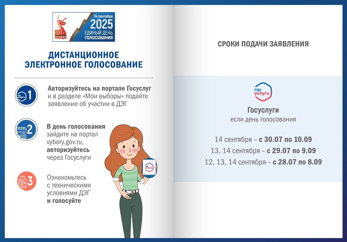 ГОЛОСУЙ ОНЛАЙН — ПРОСТО, БЫСТРО, УДОБНО! На выборах в единый день голосования 14 сентября 2025 года у жителей Южного Урала будет возможность проголосовать дистанционно! Дистанционное электронное голосование (ДЭГ) – это АЛЬТЕРНАТИВНАЯ возможность проголосовать онлайн из любого места с помощью любого устройства с доступом в интернет: компьютер, планшет или смартфон. Проголосовать можно, находясь дома или в гостях, в отпуске или в командировке, на даче или на природе, без посещения избирательного участка. В ЛЮБОЙ точке России. Для того, чтобы проголосовать ДЭГ, необходимо пройти 2 этапа: 1 ЭТАП! С 28 июля по 24:00 часов московского времени 8 сентября 2025 года через портал Госуслуг подать Заявление ДЭГ. Пройти проверку соответствия данных и включение в списки участников ДЭГ. 2 ЭТАП! С 8:00 12 сентября до 20:00 14 сентября 2025 года проголосовать электронно на vybory.gov.ru после процедуры идентификации личности. Принять участие в ДЭГ смогут граждане России: - достигшие на день голос