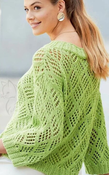 Здравствуйте, дорогие! Салатовый - цвет свежести, ранней весны, обновления. На мой вгляд он подходит и блондинкам, и брюнеткам. Не менее важным преимуществом данного оттенка можно назвать его универсальность. Без труда можно комбинировать его с белыми брюками и юбками, к примеру. Но не менее хорош салатовый в тандеме с жёлтым, коричневым, чёрным, серым. Салатовая пряжа одинаково востребована для создания объёмных пуловеров и кардиганов, и нежных, воздушных кофточек для лета и весны. Большинству вязальщиц знакомо чувство переизбыточного вязания. Многие идеи откладываются в волшебную копилочку, которую хочется вновь и вновь открывать и пересматривать, позволяя себе мечтать о новой уникальной обновке. Но я все-таки за то, что нужно обязательно выгуливать свои шедевры. И салатовый джемпер - как раз то, что идеально будет подходить и для того, чтобы побаловать себя и днями изысканного творчества, и днями потрясающих прогулок в авторских вещах. Считаю такой подход наиболее органичным. Ка