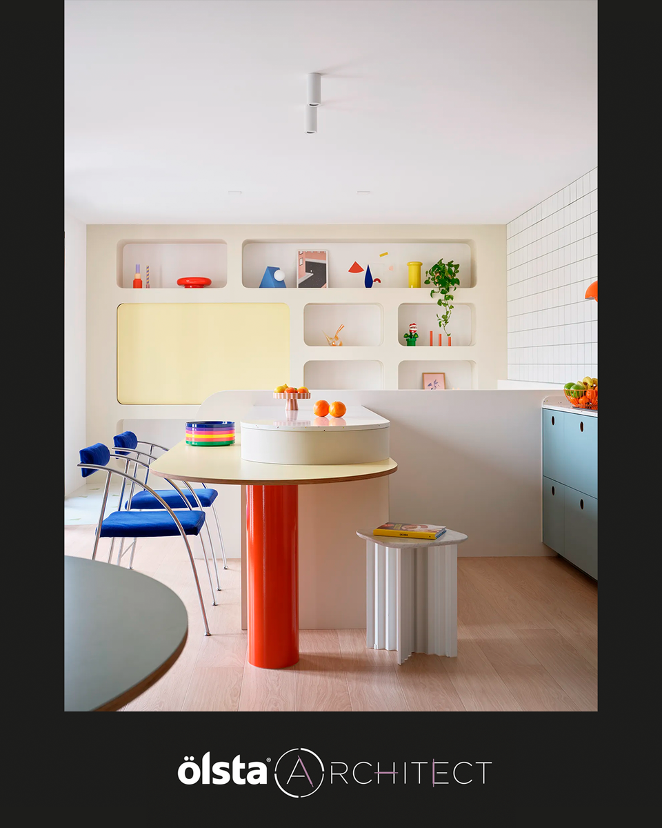 В Барселоне эксперименты с цветом уже стали частью городской культуры. Проект от Not a Studio – реконструкция нового жилого пространства для молодой семьи – показывает, как через цвет, форму и графику можно придать характер изначально нейтральной квартире. Центром композиции здесь становится система мягких кривых: изогнутая кухня, круглая обеденная зона, органичные линии напольной плитки и арочные ниши создают ощущение пластичности и движения. Дизайнеры выстроили интерьер на стыке пастельных тонов и чистых акцентов: доминируют нежные розовые, молочные, светло-бежевые фоны, которые балансируют яркие вкрапления – синие, лимонно-желтые, зеленые, оранжевые и красные. Это почти графическая палитра, которая дает интерьеру характер, но при этом остается комфортной для повседневной жизни. Важно, как работают акценты: они появляются не только в текстиле, но и в геометрических паттернах, форме мебели, плитке и даже зеркалах. Здесь видно влияние графической эстетики поп-арта и комиксов, напоминаю