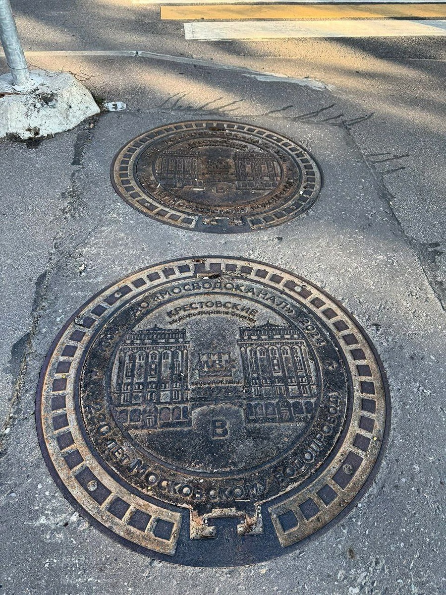 Почему в Мытищах, столице водопровода, таких красивых люков нет? В Ярославском районе рядом с МГСУ можно увидеть весьма стильные памятные люки в количестве 4 штук. Всего их было изготовлено 220 штук к 220 летию водопровода. На люках изображены Крестовские водонапорные башни, куда шла вода из Мытищ через Ростокинский акведук. Башни эти были сооружены в 1892 году у Крестовской заставы (ныне Рижская площадь) при реконструкции Мытищинского водопровода. Основным заказчиком и спонсором постройки был купец и городской голова Москвы — Алексеев Николай Александрович. Чтобы не затруднять движение транспорта, в 1939 году башни снесли, а Ярославское шоссе реконструировали. Фото: М125