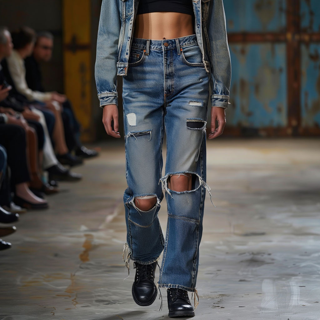 - Максимальные потертости: Джинсы с искусственными разрывами, выцветшими участками и необработанными швами. Например, Diesel в коллекции весна-лето 2024 представил модели с деконструкцией — карманы свисают, как лоскуты, а колени полностью «вырезаны».