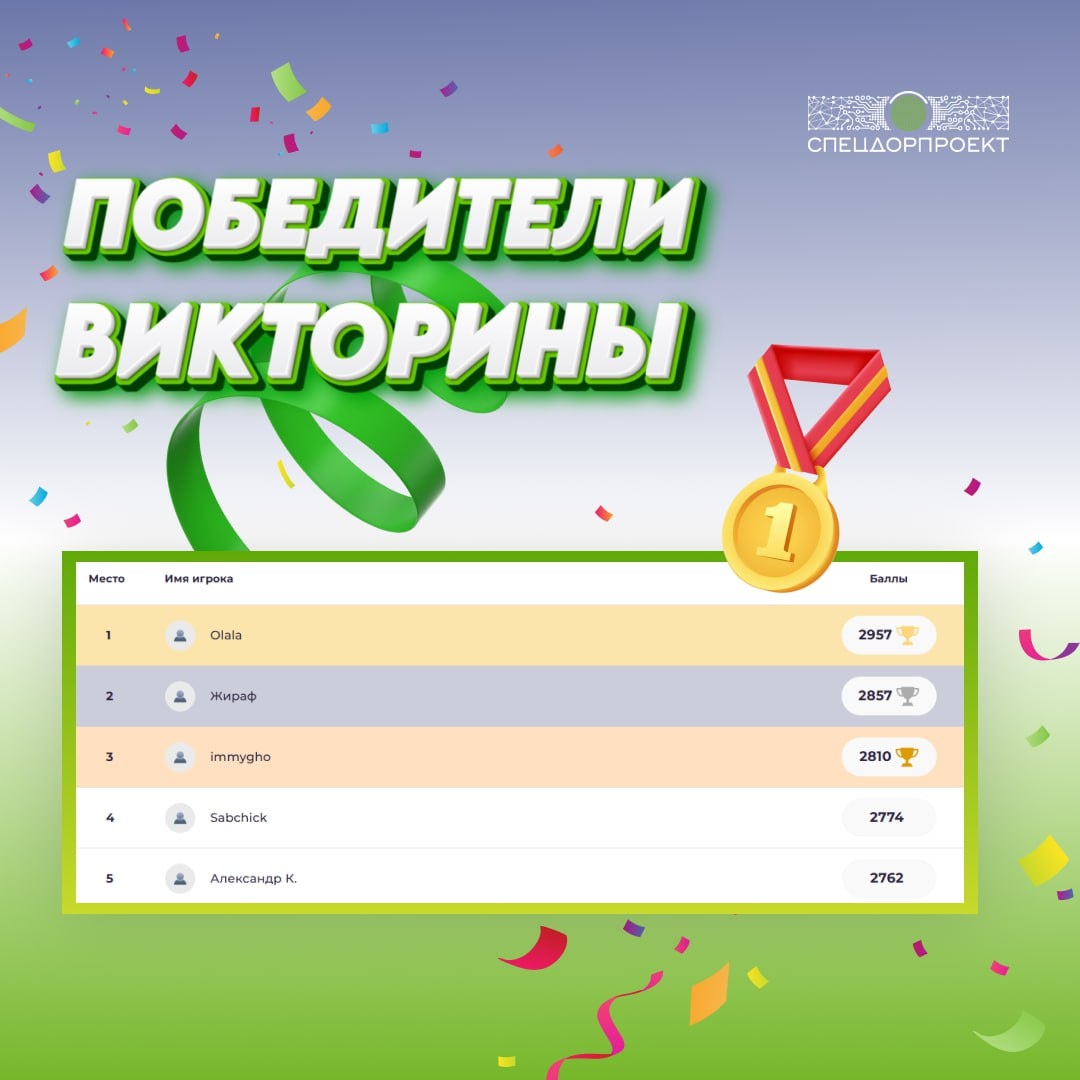 🚦Объявляем 5 победителей викторины ко Дню светофора! Правильно на все 20 вопросов удалось ответить только 2 участникам, а самым сложным оказался вопрос о еженедельной субботней рубрике на канале — «Человек недели», на который корректно ответили только 28% участников. 🏆 Наши победители: 1. Ольга (Olala) 2. Наталья (Жираф) 3. Виктор (immygho) 4. Сабина (Sabchick) 5. Александр (Александр К.) Они получают годовую подписку Telegram Premium! ⏺️Для тех, кто не успел принять участие, открыли викторину для прохождения вне зачёта. Благодарим всех за участие!