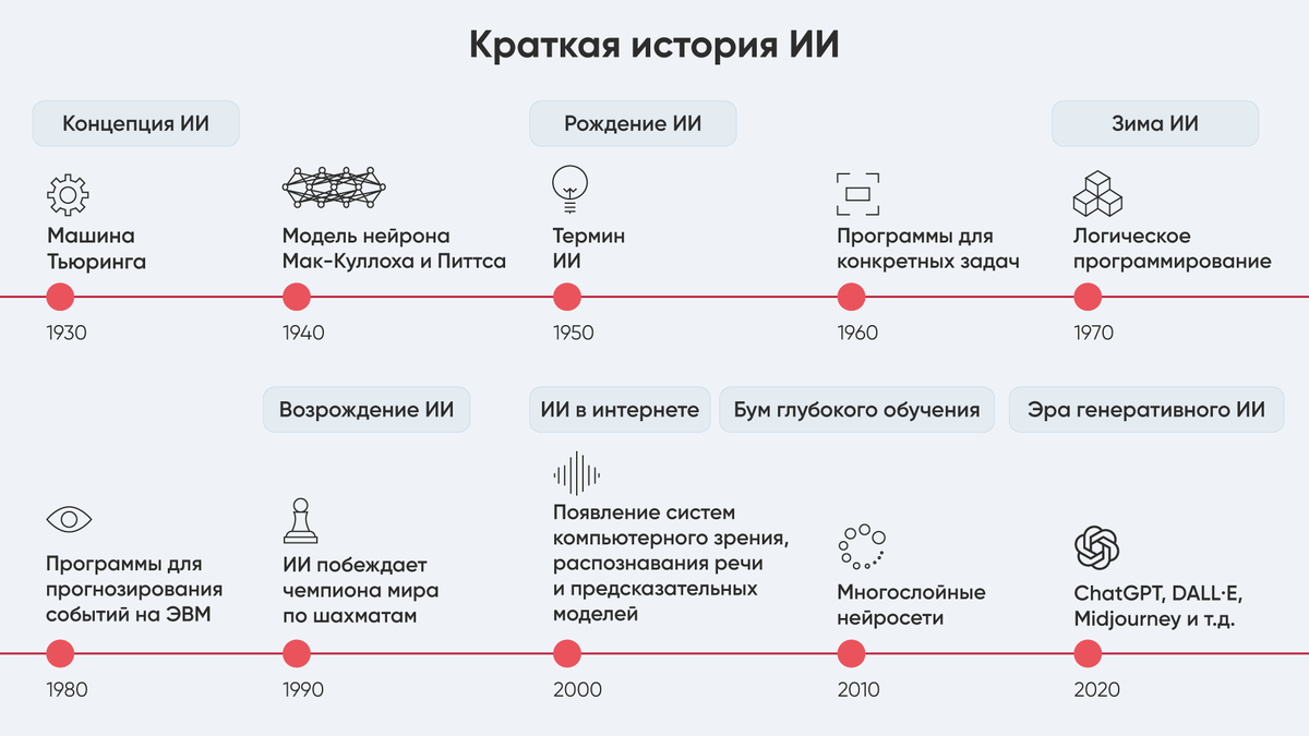 Интерес к искусственному интеллекту и количество дискуссий по теме резко возросли примерно 15 лет назад. Однако как концепция ИИ стал заметен гораздо раньше — еще в 30-ых годах XX века. Коротко рассказываем историю его развития — от первых идей до современных технологий. 1930: концепция ИИ — Машина Тьюринга В 1936 году математик Алан Тьюринг предложил концепцию абстрактной вычислительной машины — Машины Тьюринга, которая могла бы выполнять любые вычисления, если они алгоритмически формализуемые, то есть описаны с помощью четкой последовательности шагов — алгоритма, который можно выполнить на компьютере или другой вычислительной машине. Эта идея стала фундаментом теории вычислений и заложила основу для понимания, как машины могут обрабатывать информацию. Подробнее о машине Тьюринга, ее назначении и принципе работы можно почитать, например, в материале Skillbox Media. 1940: модель нейрона Мак-Куллоха и Питтса В 1940-х годах Уоррен Мак-Куллох (нейрофизиолог и нейропсихолог) и Уолтер Питтс