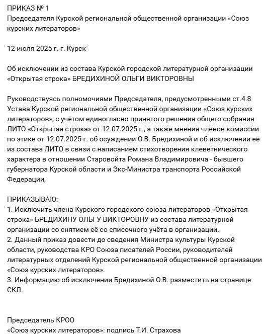 Как утверждают корреспонденты федеральных СМИ, Союз литераторов Курской области, тщательно изучив стихотворение, принял решение об исключении Бредихиной из рядов этой общественной организации.