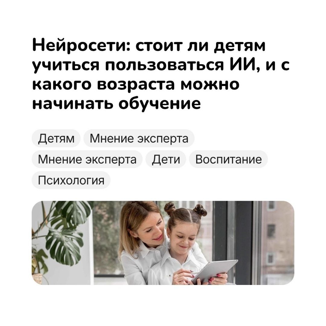 Ребята, вышла моя новая статья на MAMADO. Искусственный интеллект (ИИ) давно стал частью нашей жизни. Но нельзя забывать и о наших детях. Как и когда говорить с ними о нейросетях, чтобы они не боялись их и в тоже время не считали их волшебством? Об этом и не только говорю в статье. Полностью читайте здесь: 📍Нейросети: стоит ли детям учиться пользоваться ИИ, и с какого возраста можно начинать обучение. Прочитайте и поделитесь в комментариях, что думаете об этом👇