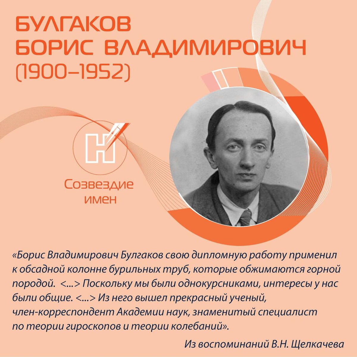6 августа 1900 г. родился советский ученый-механик, педагог, член-корреспондент АН СССР Борис Владимирович Булгаков. Уроженец Москвы, дворянин. В 1918 г. окончил среднюю школу. В 1918 – 1920 гг. служил в Главном комитете государственных сооружений ВСНХ. В 1920 – 1924 гг. – служба в РККА. В 1923 – 1928 гг. – студент физико-математического факультета Московского государственного университета, который окончил по специальности «Теория механики». Ученик Н.Н. Бухгольца и Л.С. Лейбензона. В 1928 – 1930 гг. – научный сотрудник Государственного исследовательского нефтяного института. С осени 1928 г. по совместительству преподавал в Московской горной академии. В 1930 - 1951 гг. работал ассистентом, доцентом, профессором, заведующим кафедрой прикладной механики Московского государственного университета, в 1930–1936 гг. - профессором, заведующим кафедрой механики Московского геолого-разведочного института, в 1932 - 1939 гг. — консультантом Научно-исследовательского института № 12 Наркомата