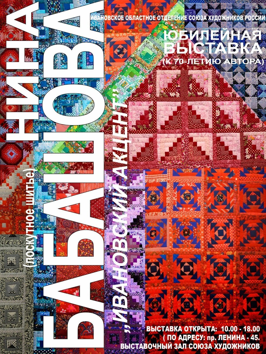 В Иванове открывается выставка лоскутного шитья В Иванове 15 августа открывается персональная выставка Нины Бабашовой «Ивановский акцент» (0+). Экспозиция посвящена юбилею признанного мастера. Уроженка поселка Писцово Комсомольского района более 30 лет занимается лоскутным шитьем. На выставке представлено множество призведений уникального мастера. Нина Евгеньевна предпочитает работать с ивановскими ситцами, используя в частности фрагменты тканей известных ивановских художников текстильного рисунка - В.А. Колесова, Л.И. Зиминой, М.Б. Тощевой. За плечами Нины Бабашовой более 40 персональных выставок, ее произведения находятся в собраниях и музеях Москвы, Кишенева, Иванова, Плёса, Фурманова, в частных коллекциях в России, США, Италии. Нина Евгеньевна — многократный лауреат и призёр фестивалей и выставок лоскутного шитья, как Всероссийских, так и международных. Фото: ИОО «Союз Художников России»