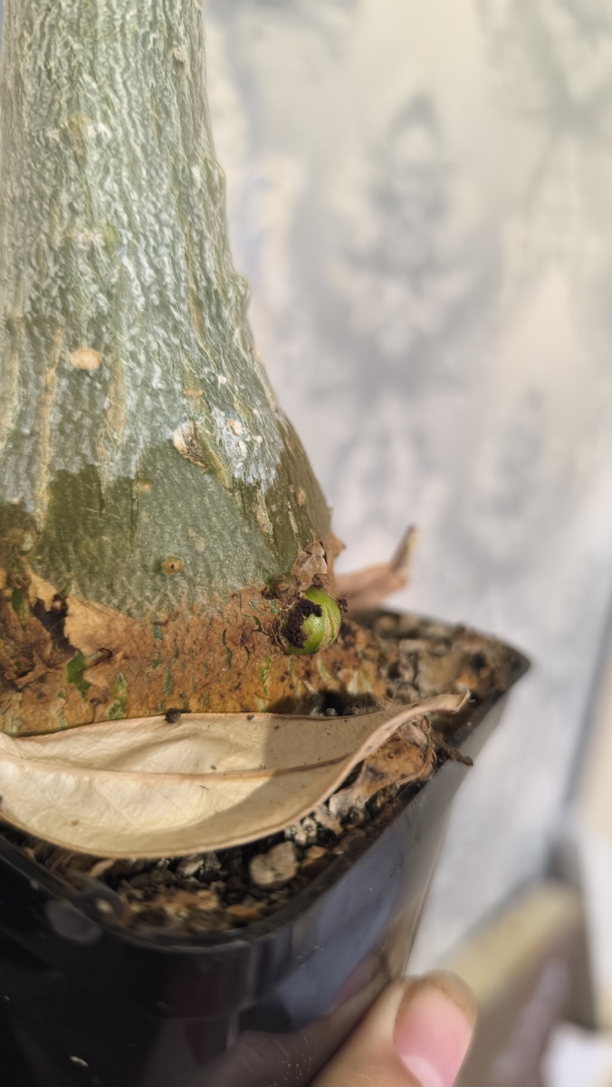 И так о чем вообще речь? При поливе или из за особенности воды либо из за удобрений которые мы в нее добавляем на поверхности грунта и на каудекс часто образуется желто- рыжий налет. Похожий на накипь в чайнике, хотя почему похожий, по идее это точно такое же отложение солей. На каудекс это выглядит примерно так плюс минус. Вот та рыжая полоса у грунта это не кора растения, а соли. В принципе жить растениям этот солевой панцирь не мешает, но вот эстетическая сторона часто страдает и не всем нравится такой грязный вид растения. Убрать его можно но не на сухую. По идее есть несколько средств которые помогут в этом деле. Раствор лимонной или янтарной кислоты, но на мой вкус они очень медленно действуют и потом долго ещё отирать надо. Раствор обычной соды тоже говорят эффективен но сама не пробовала. Я для себя третий вариант выбрала. Вчера как раз пересаживала прививку на продажу и отмывала ей филей. В сухом виде эта ерунда не так страшно выглядит. Для отмывки я беру перекись водорода