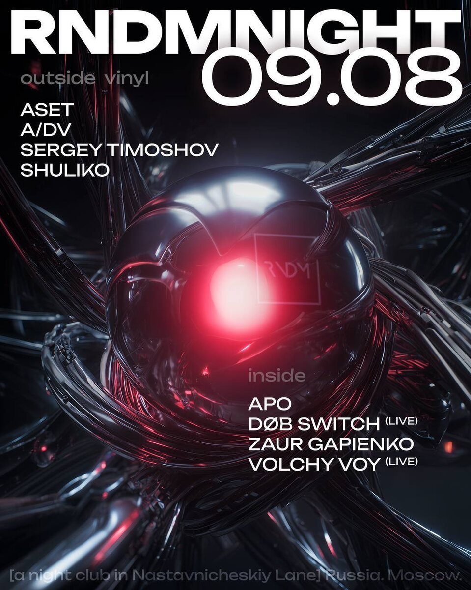 9 АВГУСТА | RNDM NIGHT Мы решили, что нам очень не хватает летних встреч во дворе, поэтому сразу же делаем ещё один RNDM.NIGHT с летним двором. Внутри — лайвы и знакомые вам артисты. APO DOB SWITCH (LIVE) ZAUR GAPIENKO VOLCHY VOY (LIVE) Во дворе будет звучать исключительно виниловая селекция от опытных диггеров. ASET A/DV SERGEY TIMOSHOV SHULIKO 🎫 - rndm2night.ticketscloud.org 📆 9 августа, с 22:00 📍 RNDM, Москва, Наставнический пер., 13/15с3