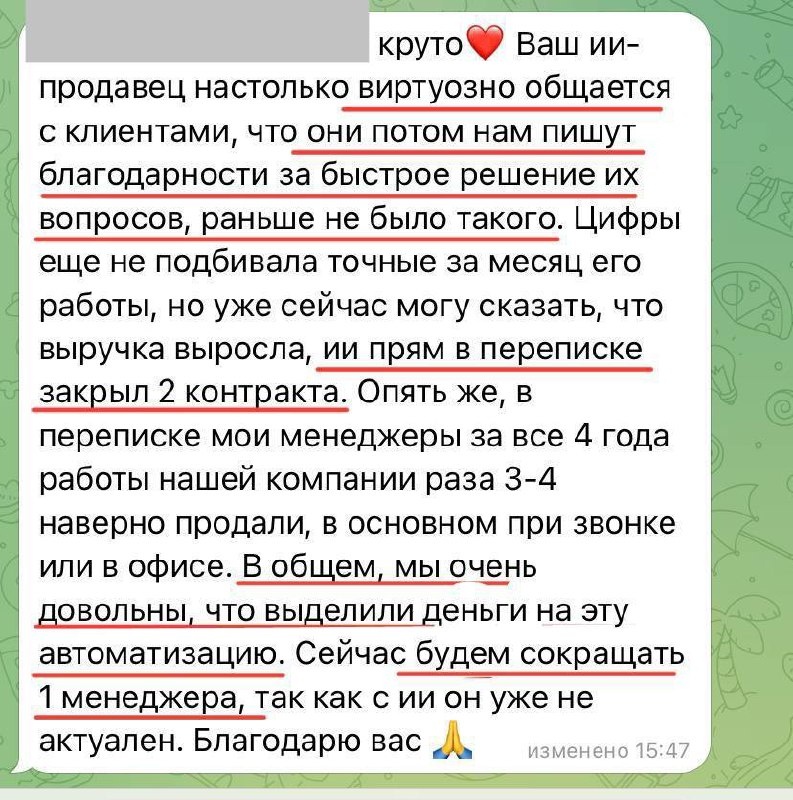 Как закрыть 2 продажи в переписке, пока ваши менеджеры в отпуске? Недавно внедрили ИИ-продавца клиенту. Через неделю он пишет: «Люди благодарят нас за скорость! Такого раньше не было. Ваш ИИ закрыл 2 сделки прямо в переписке. Наши менеджеры за 4 года максимум 3-4 раза продавали в чате, всё остальное звонки или встречи» Мне как эксперту по продажам нравится, что можно автоматизировать продажи и при этом покупатель не узнает что с ним общается робот. Потому что настолько все детально оттачивается скрипты, tone voice, даже шутки. Встречали ли уже таких ии продавцов ? #система продаж с ии