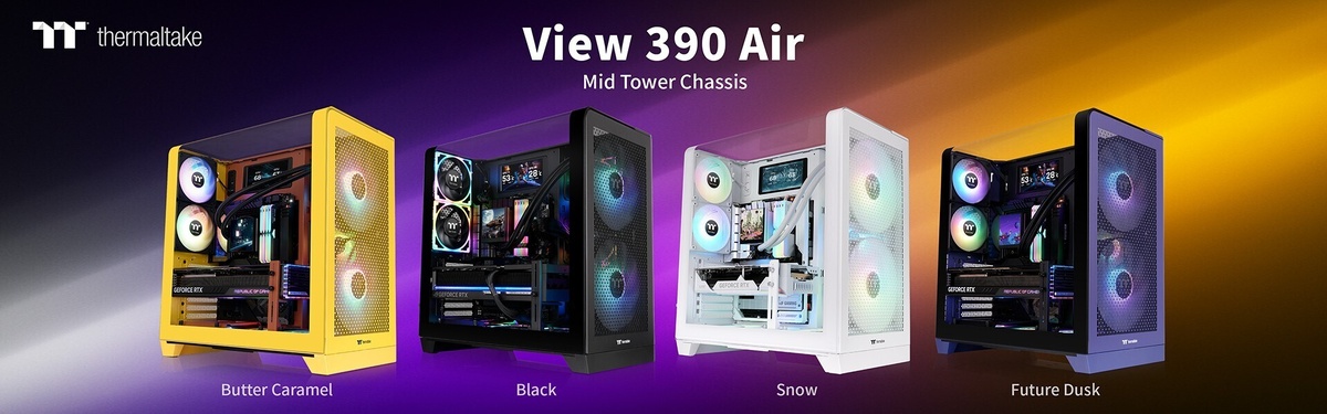 Thermaltake представляет новый корпус View 390 Air Mid Tower формата ATX в четырёх разных расцветках: чёрной, белой (Snow), фиолетовой (Future Dusk) и жёлтой (Butter Caramel), — сообщает TechPowerUp. Корпуса отличаются необычной компоновкой с продуманными воздушными потоками, поддержкой скрытой прокладки кабелей и материнских плат с подключением разъёмов на тыльной стороне (включая модели Asus BTF, MSI Project Zero и Gigabyte Project Stealth). Источник изображения: Thermaltake View 390 Air оснащается панелью с цельным изогнутым закалённым стеклом толщиной 4 мм, которая закрывает корпус сбоку и сверху, обеспечивая полный обзор внутренних компонентов. Передняя панель сделана сетчатой для улучшения вентиляции. Корпус позволяет установить до одиннадцати 120-мм вентиляторов, спереди поместятся два 200-мм вентилятора или 360-мм радиатор системы жидкостного охлаждения (СЖО). Также радиатор СЖО можно установить рядом с материнской платой. Два фирменных вентилятора CT120 входят в комплект и уст