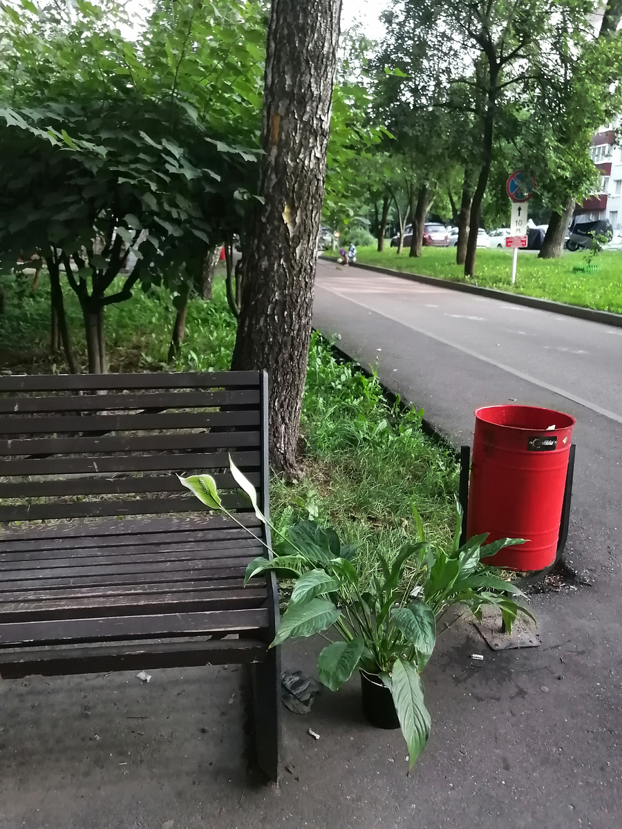 Точнее, не взяли. А вообще роскошное создание. За что с ним так?! Почему его изгнали? Дело было под вечер. Идём с мужем, мороженое в руках, не распечатанное. Лавочку ищем. Та, на которой собирались приземлиться, была занята. Там цветник красивый. И занятный в какой-то мере. Расскажу как-нибудь. Я ещё не всё про него поняла. А тут расскажу про странного найдёныша. Лавочка впереди свободна, подходит! И что-то рядом стоит, издали видно. А на предыдущей скамейке какие-то смятые газеты лежали. Рядом кот чересчут активно красоту наводил. Так что там мы останавливаться не стали, прошли чуть дальше. К скамейке свободной, вроде бы чистой. "Не так" оказалось комнатным растением. Спатифимллум вроде? Т.е., флаголист. Но я всегда считала, что спатифиллумы вдвое или втрое меньше, компактнее. А этот огромный! Я похожее, только антуриум, во Вьетнаме видела. Но там условия для роста подходящие. А тут? Растение отличное, без видимых проблем. По крайней мере, я ничего подозрительного не заметила. И с
