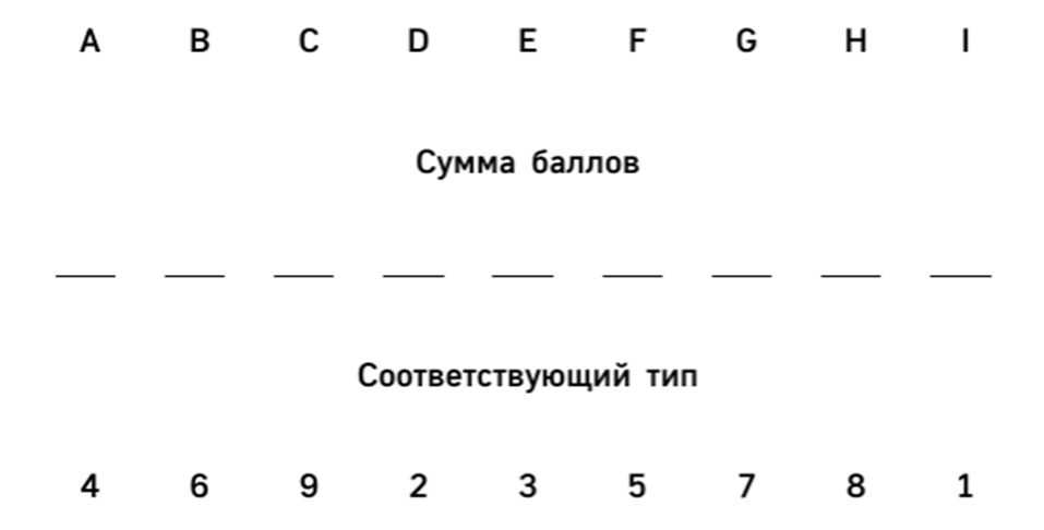 1. Перенесите баллы из строк «общий результат» внизу каждого раздела в соответствующие строки ниже. Например, сумма баллов из раздела «Тип личности А» должна быть записана в строке прямо под буквой А. Числа под строками на этой странице соответствуют типам личности по эннеаграмме. Наибольшая сумма баллов, как правило (но не всегда), указывает на ваш тип.