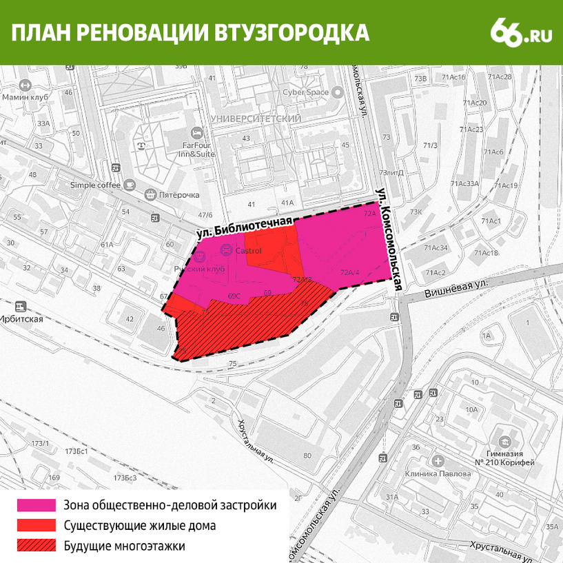 Компания Baza Development Марка Заводовского готовит проект застройки промзоны напротив концерна «Калина». Речь идет о площадке в районе улиц Библиотечная и Комсомольская, где раньше работала продовольственная торгово-закупочная база. Девелопер перевел участок почти в два гектара из зоны Ц-4 (торговые объекты) в зону Ц-2 (общественно-деловая зона). Такой режим позволит строить здесь высотные дома. По предварительным данным, Baza Development запроектировала 85 тыс. кв. метров жилья. Даже по меркам Екатеринбурга — это плотная застройка. Недавно экспертиза выдала положительное заключение на проектную документацию первого дома из четырех секций и подземного паркинга. Под застройку также попадет и соседний участок, где находились хозяйственные корпуса завода футеровочных материалов.