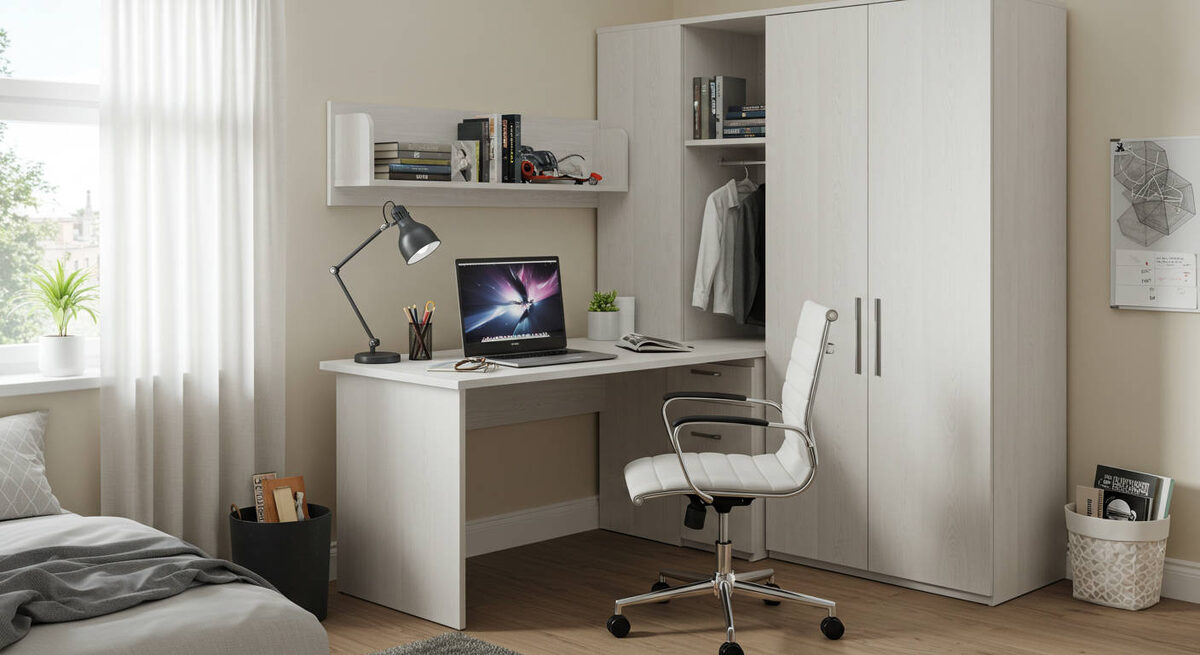 Главное — функциональность и возможность роста. Стол должен быть достаточно большим для учебников и компьютера. Идеально — с регулируемой высотой, чтобы он «рос» вместе с ребенком. Важны системы хранения для школьных принадлежностей и книг. Не забудьте про хорошее освещение.