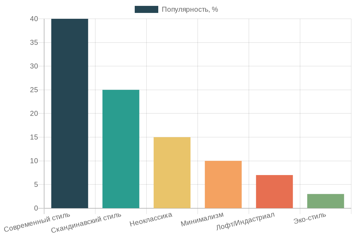 Как видите, современный и скандинавский стили удерживают лидирующие позиции, предлагая идеальный баланс эстетики и практичности. Минимализм и неоклассика также активно завоевывают сердца, каждый по своим причинам.