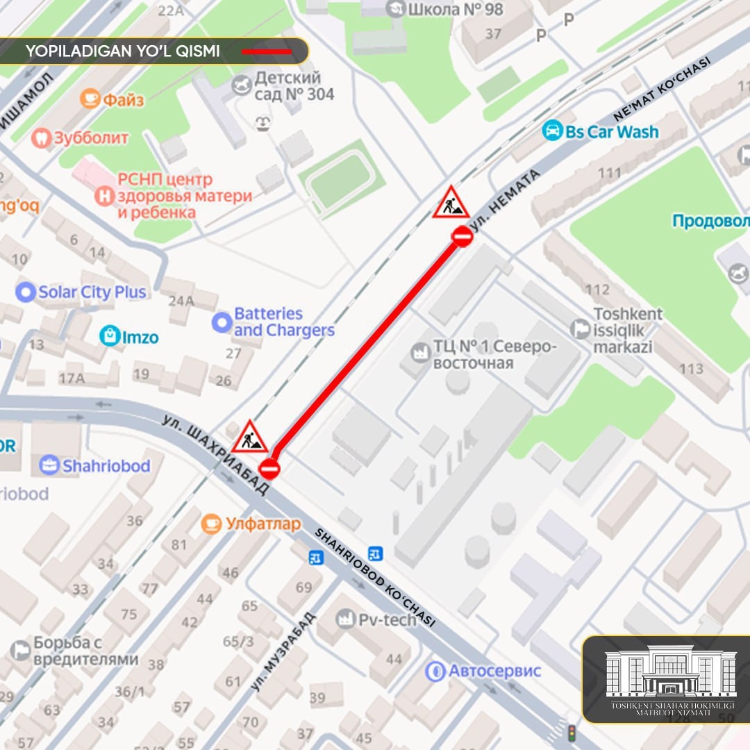 Mirzo Ulug'bek tumani Ne’mat ko‘chasi vaqtincha yopiladi Drenaj quvurlarini almashtirish ishlari bajarilishi sabab ko‘chaning 1-sonli qozonxonadan Shahriobod ko‘chasigacha bo‘lgan qismi 2025-yil 7-avgust kuni soat 07:00 dan 8-avgust kuni 07:00 gacha avtotransport harakati uchun yopiladi @daryolive
