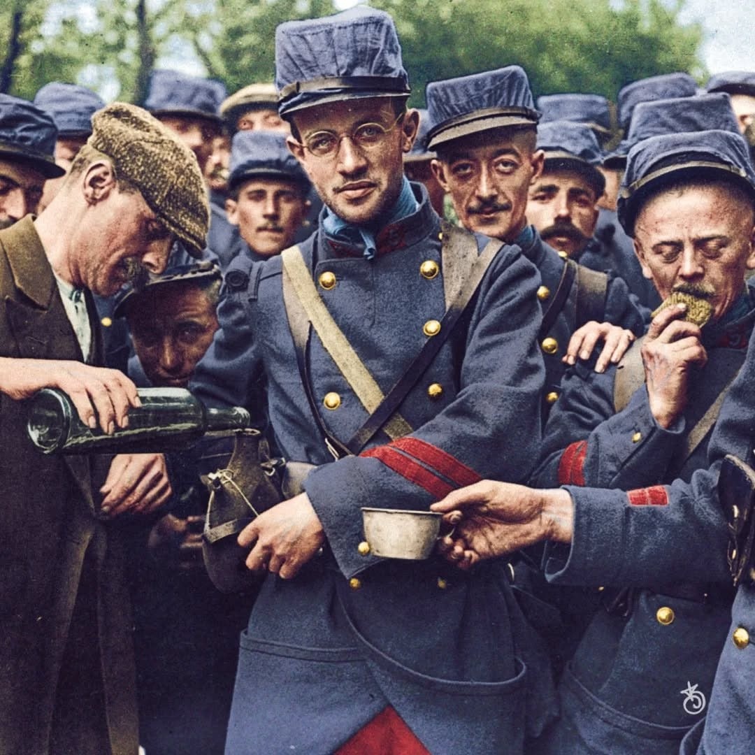 Французские солдаты 5-го пехотного полка получают вино от парижского мирного жителя во время ожидания отправки на фронт, 6 августа 1914