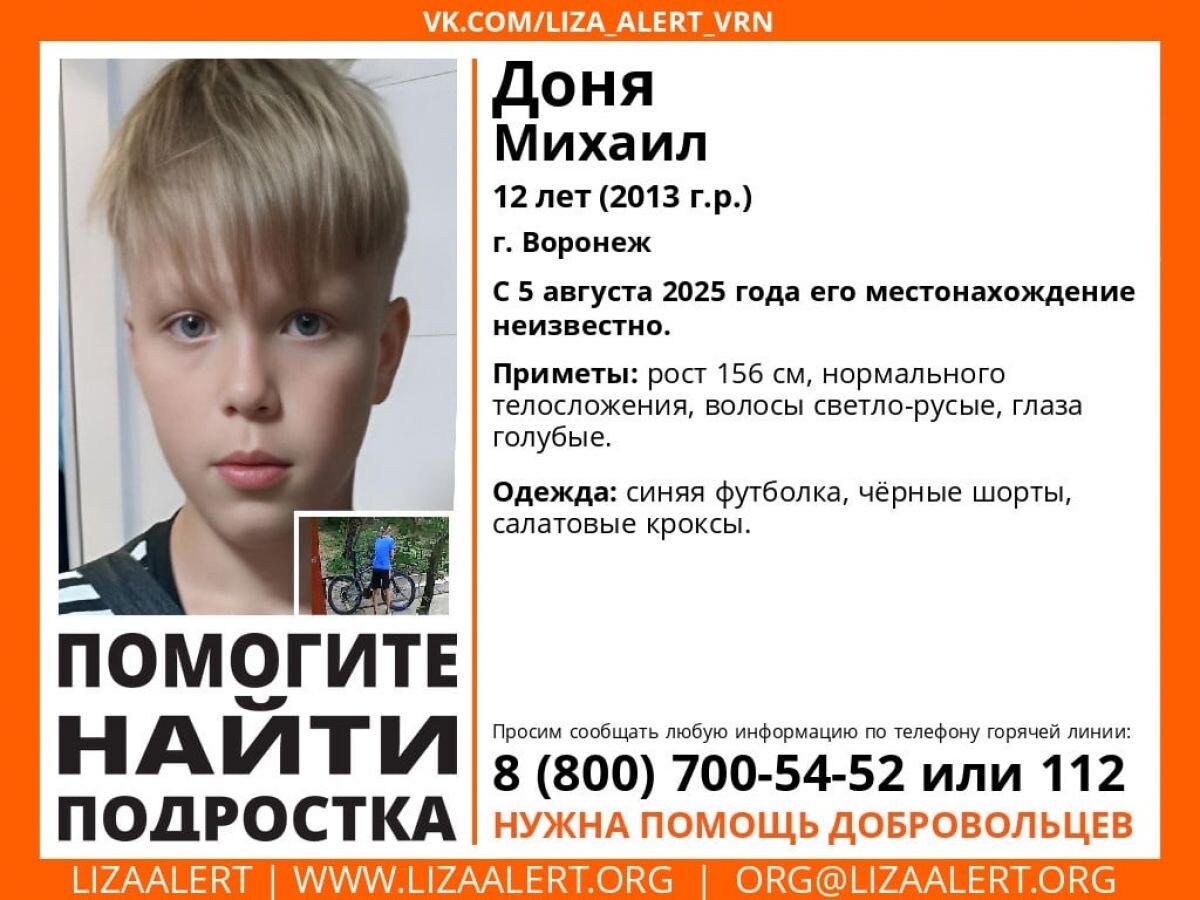 Сотрудники региональных СК и МВД организовали доследственную проверку по факту исчезновения 12-летнего Михаила Дони. Мальчик пропал на левом берегу города. Об этом со ссылкой на пресс-службу СУ СК России по региону сообщают коллеги из издания «Обозреватель.Врн». Следователи совместно с сотрудниками полиции выполняют комплекс мероприятий, направленных на установление обстоятельств произошедшего и места нахождения пропавшего без вести ребенка. Напомним, Михаил Доня пропал 5 августа. Рост мальчика — 156 см, у него нормальное телосложение, светло-русые волосы и голубые глаза. На момент исчезновения Михаил был одет в синюю футболку, черные шорты и салатовые «кроксы». Информацию о местонахождении Михаила Дони можно сообщить по телефону 8 (903) 654-20-06.
