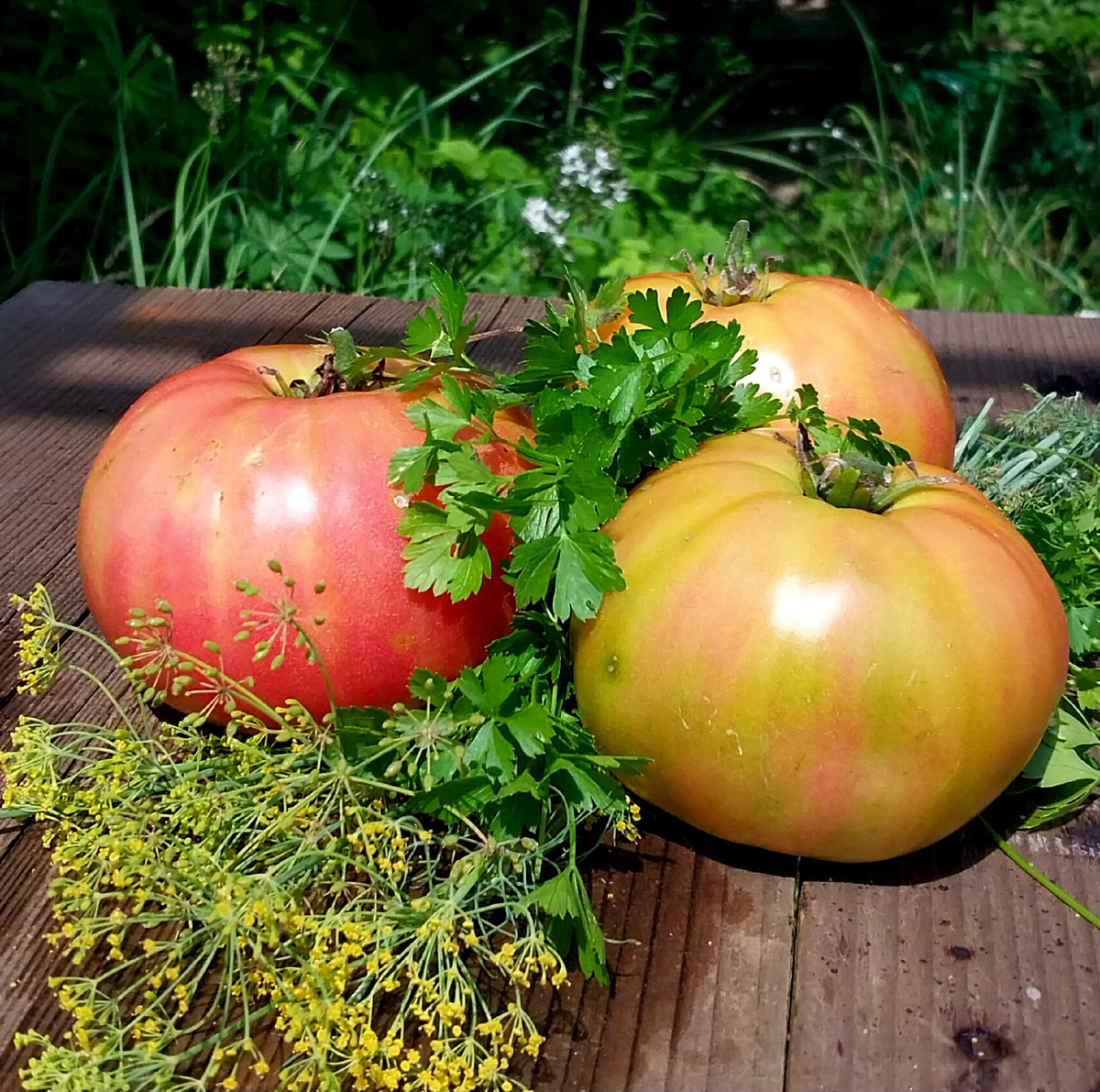 Семена этого томата в количестве 10-ти штук получил в подарок от хорошего товарища. Гостил он где-то в тех краях и привез мне пакетик. Конечно же было принято решение попробовать вырастить этот сорт в средней полосе в открытом грунте. По основным сортовым характеристикам все сошлось: время созревания, внешний вид, вкус, даже вес. Томат на переднем плане весит 450гр. при заявленном среднем весе 300-500. Плодов на кусте достаточно. Единственное, что имеет разницу - размеры куста. Производитель указывает, что куст детерминантный. Очевидно, это справедливо при выращивании в закрытом грунте. Мои кусты выросли не более 70-80см. В целом, томатом доволен. Думаю насобирать семена и выращивать дальше...