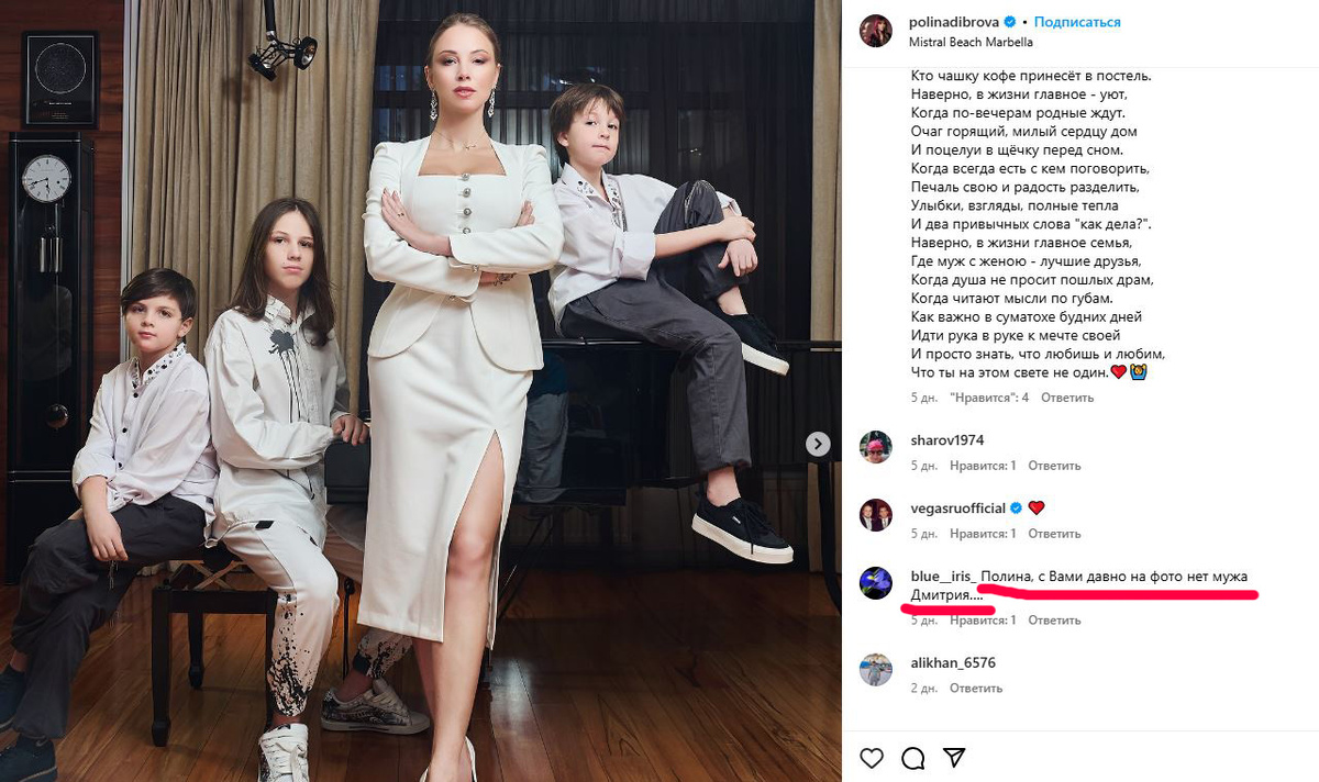 Бледанс, конечно, поспешила снять с четвёртой жены Дмитрия Диброва обвинения в предательстве, заявив, что Полина и Елена не общались близко уже много лет, хотя и оставались в статусе крёстных матерей.