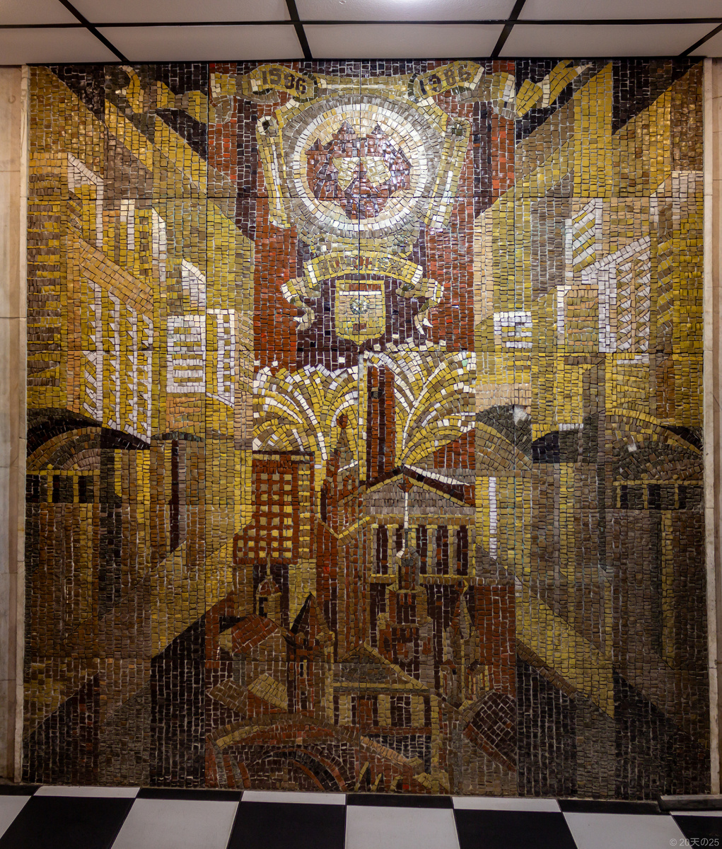 Мозаика создана в 1971 году советским художником Юрием Казинером. На ней изображена идеальная советская семья. Отец представлен в образе рабочего: в одной руке у него молот, а другой он опирается на большую шестерню, как символ промышленности СССР. Женщина-мать — в образе колхозницы, обнимающей подсолнух, символизирующий урожай. Девочка в образе юной гимнастки, что символизирует устремления подрастающего поколения. Композицию венчает символическое солнце и голубь мира.