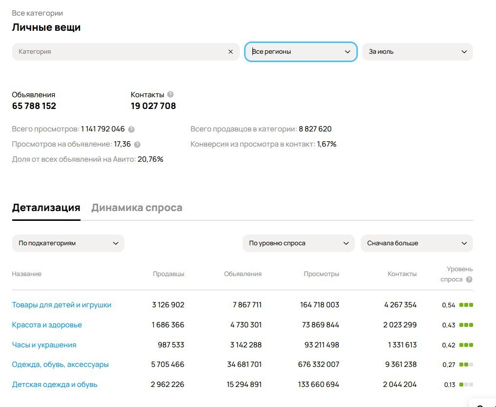 Спускаемся внутрь категории "Личные вещи", картина похожа на июнь. Наверху "Товары для детей и игрушки", а "Детская одежда и обувь" с ужасающе низким спросом болтается внизу списка.