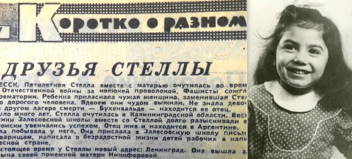 «О её [Стеллы] необыкновенной судьбе учащиеся Залесовской средней школы узнали из газет два года назад. Написали ей коллективное письмо в Новозыбков, где она тогда жила. Пришёл ответ, за ним второй, третий. А потом ребята узнали, что Стелла нашла отца. Он чудом уцелел в Бухенвальде и живёт теперь в Бразилии. Дочь побывала у него в гостях».