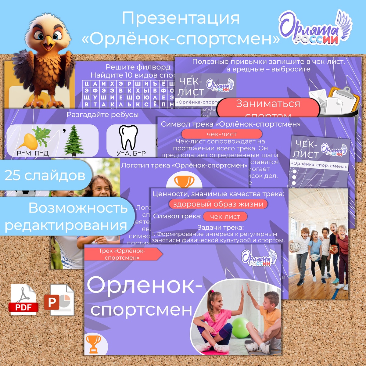 Презентация «Орленок-спортсмен» для внеурочной деятельности «Орлята России». Трек «Орленок-спортсмен» для обучающихся 1-4 классов. Презентация включает в себя 25 слайдов. Помимо теоретической части презентация содержит практические задания. Презентация сопровождается красочными иллюстрациями. Содержится анимация. Содержание: Презентация в формате PPTX и PDF. Есть возможность редактирования.