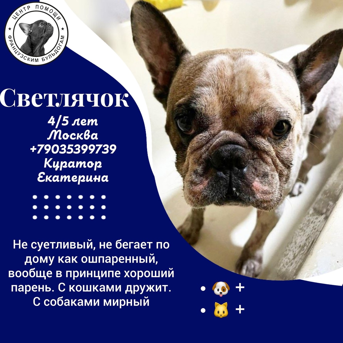 Знакомьтесь с новым малышом , назвали его #Светлячок@frenchbull_help ✨ https://vk.com/topic-144285450_54723861 Мальчик гулял по улицам Воронежа, увидели его неравнодушные люди и хотели забрать, НО мимо проходящие девушки, сказали, что собака их брата и нечего его трогать, нагуляется и вернется домой 😡 В последующие дни его так же не однократно видели…. Были написаны посты и объявился хозяин, который сказал забирать парня, только без возврата, а то время у мальчонки до 23 августа осталось.... Почему ему отмерен такой срок, никто не знает 🤷🏼 Привезли в Москву, доктор в клинике (повидавшая не мало булок) ужаснулась какой он грязный, моет, моет, а грязь не заканчивается …. Мальчик добрый, нежный, недолюбленный, недоласканный, прижимается к человеку, чтобы его гладили. Вообще, весь положительный буль. Ни к кому не пристаёт, ни на чем не настаивает, приходит и из под лобья не злобно, но обиженно смотрит. Игрушками не интересуется, подойдёт понюхает и отходит. 👉 https://vk.cc/cOhh6Y