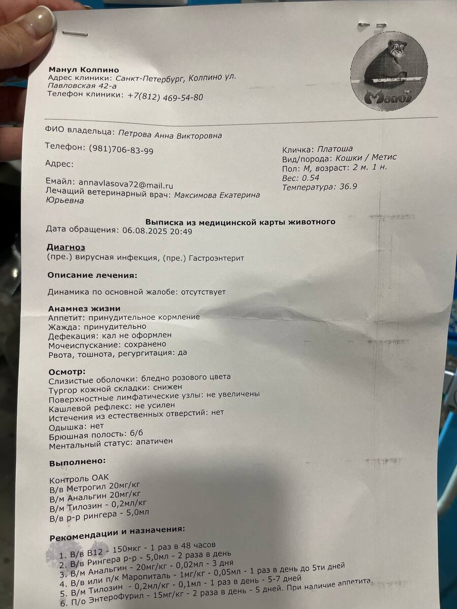 Только что вернулась из клиники с Платошей. Есть две новости: 1)Клинический Анализ лучше Но состояние не очень 2)Похудел на 100 грамм Поменяли антибиотик, лечим кишечник, наблюдаем за динамикой, важно, что бы начал кушать. В этом посте есть большое видео, которое не загрузилось в Дзен. Откройте оригинал поста в телеграме, чтобы его посмотреть