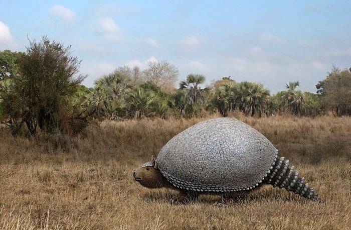 ..Солнце медленно поднималось над плоскогорьем, и пыльная саванна окрашивалась в цвета янтаря и охры. Трава колыхалась под дыханием ветра, пересыпая утреннюю прохладу сухим шёпотом. В самом центре этого мира, древнего и почти неподвижного, медленно двигался глиптодон - гигант, чьё время пришло задолго до человека. Он не спешил. Его шаги были уверенными, тяжелыми, но размеренными, как будто он знал: всё уже случилось, и торопиться незачем. Его панцирь - огромный купол из костяных щитков - сиял бледным мрамором под светом рассвета. Эта броня, сросшаяся со спиной, скрывала хрупкость и уязвимость, спрятанную в самом сердце зверя. Он был похож на оживший валун, на небольшой движущийся остров. Почти три метра в длину и весом до двух тонн, он был медлителен, но не слаб. В его облике была древняя основательность: короткие лапы с мощными когтями, плоский череп, небольшие глаза, принюхивающийся нос. Он знал запахи этих степей и умел читать по ним прошлое. Его время начиналось в плиоцене, когда н