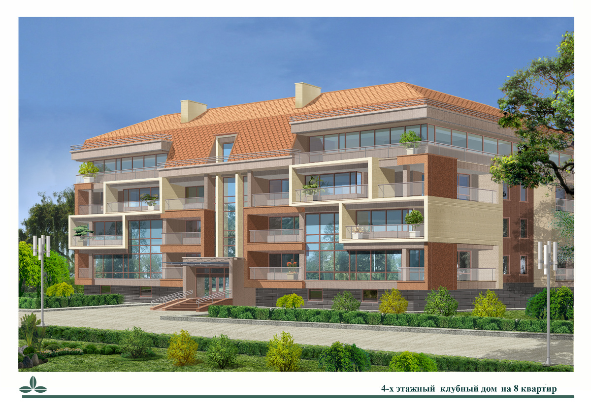 Четырёхэтажные односекционные клубные дома на 8 квартир, в г.Алматы. Проект разработан Проектно-строительной компанией «RONA LTD», г.Алматы Главный архитектор – Минский В.О. Главный инженер - Васильев Я.А.