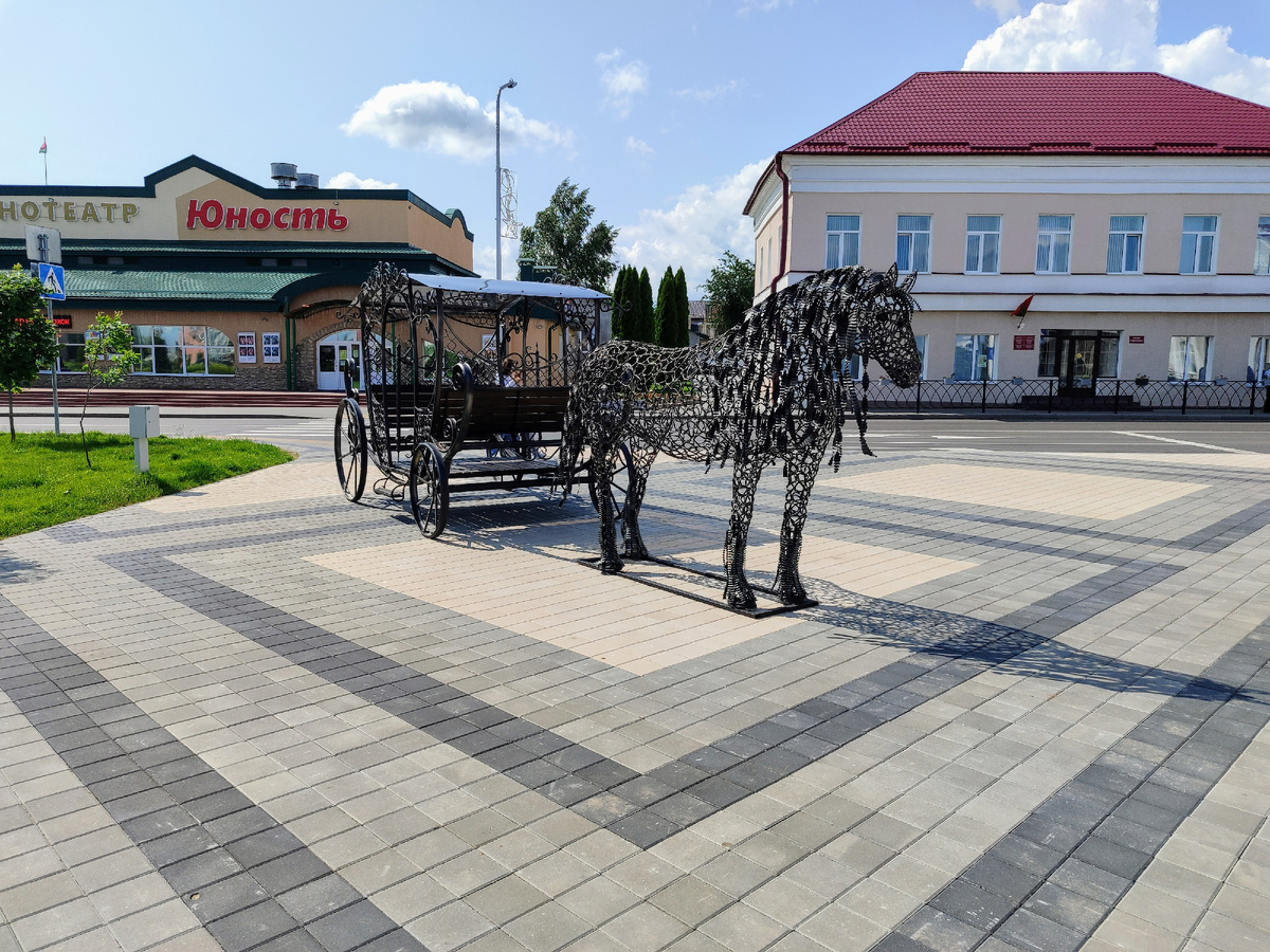 В городок Воложин заехали пообедать. Вышли на главную площадь. Советскую. Площадь большая. Какими-то арт-объектами украшена. Вокруг- здания послевоенной поры. Во время войны городок сильно разрушен был. Самое большое здание с колоннами тоже поначалу приняли за советский дом культуры. Но нет. Католический костел. В 1806–1815 годах построен. Рядом трехпролетная звонница. Немцы католический храм не тронули. А вот большевики прикрыли. Лишь в конце XX века отреставрировали. Возвратили верующим католикам. Отреставрировали не полностью. Раньше в нишах за колоннами статуи святых стояли. Поставили бы статуи- мы бы сразу сообразили. Что к чему. Самое знаменитое здание в Воложине- дворец Тышкевичей. 1806 год. Чуть дальше за костелом. Но мы пошли в другую сторону. Другие цели у нас. В начале улицы Кирова, чуть в стороне, увидели странное здание. Пол дома как будто в яму поместили. На самом деле, похоже это другую часть здания прикопали. Здание ничем особо не украшено. Только табличка на стене. Буд