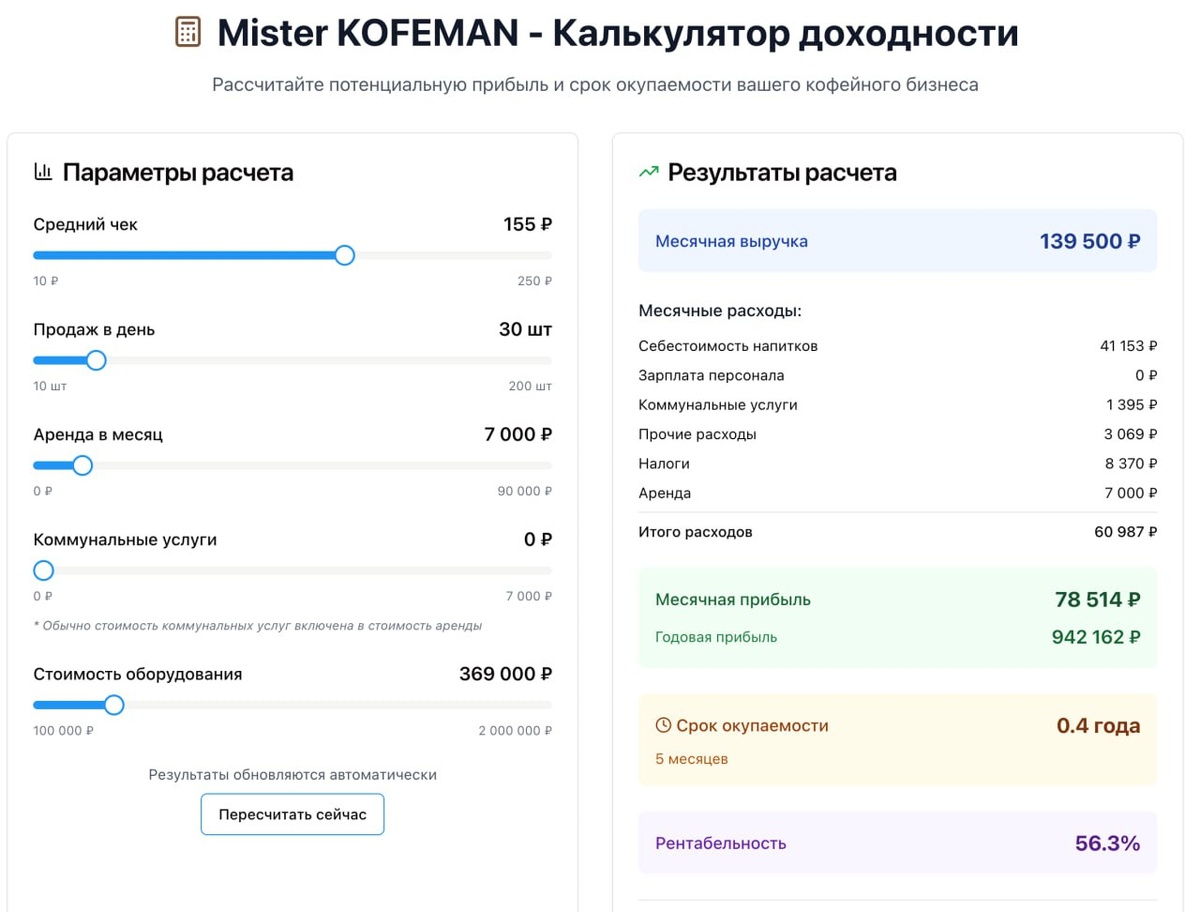 π₯ Π₯ΠΎΡΠ΅ΡΡ ΡΠ·Π½Π°ΡΡ, ΡΠΊΠΎΠ»ΡΠΊΠΎ ΠΌΠΎΠΆΠ΅Ρ ΠΏΡΠΈΠ½ΠΎΡΠΈΡΡ ΠΊΠΎΡΠ΅ΠΉΠ½Ρ ΡΠ°ΠΌΠΎΠΎΠ±ΡΠ»ΡΠΆΠΈΠ²Π°Π½ΠΈΡ? ΠΡ ΡΠ΄Π΅Π»Π°Π»ΠΈ ΡΠ΄ΠΎΠ±Π½ΡΠΉ ΠΊΠ°Π»ΡΠΊΡΠ»ΡΡΠΎΡ β Π²Π²ΠΎΠ΄ΠΈΡΡ ΡΠΈΡΡΡ ΠΈ ΡΡΠ°Π·Ρ Π²ΠΈΠ΄ΠΈΡΡ ΠΏΡΠΈΠ±ΡΠ»Ρ, ΠΎΠΊΡΠΏΠ°Π΅ΠΌΠΎΡΡΡ ΠΈ ΡΠ΅Π½ΡΠ°Π±Π΅Π»ΡΠ½ΠΎΡΡΡ. πΈ ΠΡΠΈΠΌΠ΅Ρ: β’ 30 ΠΏΡΠΎΠ΄Π°ΠΆ Π² Π΄Π΅Π½Ρ β’ Π‘ΡΠ΅Π΄Π½ΠΈΠΉ ΡΠ΅ΠΊ β 155 β½ β’ ΠΡΠ΅Π½Π΄Π° β 7 000 β½ π ΠΡΠΎΠ³: β’ ΠΡΠΈΠ±ΡΠ»Ρ β 78 514 β½ Π² ΠΌΠ΅ΡΡΡ β’ ΠΠΊΡΠΏΠ°Π΅ΠΌΠΎΡΡΡ β 5 ΠΌΠ΅ΡΡΡΠ΅Π² β’ Π Π΅Π½ΡΠ°Π±Π΅Π»ΡΠ½ΠΎΡΡΡ β 56.3% π https://kofeman.tech/calculator