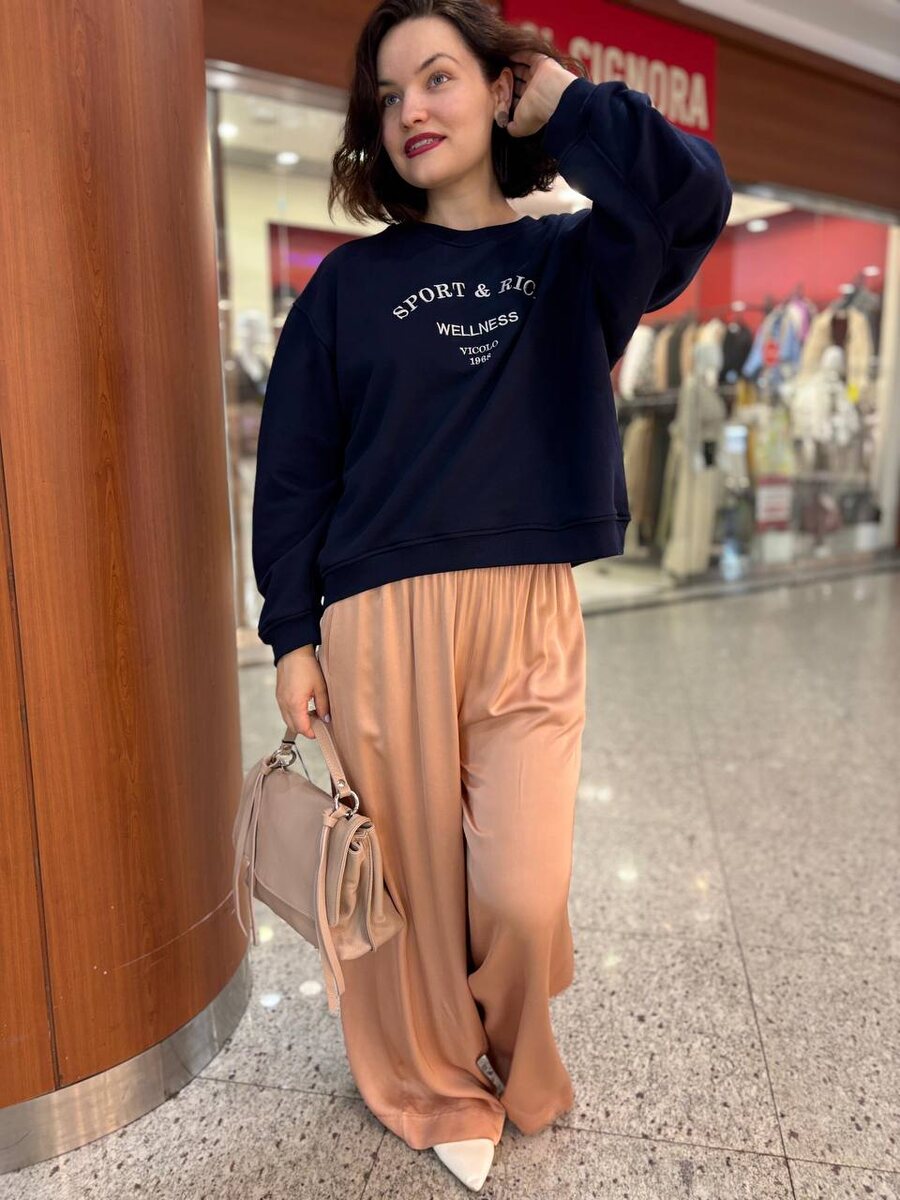 🌼Брюки из струящейся ткани в нежном персиково-бежевом оттенке Состав 100% вискоза VICOLO ITALY 🇮🇹 Размер единый 44-50 6.500₽ 🌼Свитшот VICOLO Расцветки меланж и синий Размер единый 44-50 8.800₽