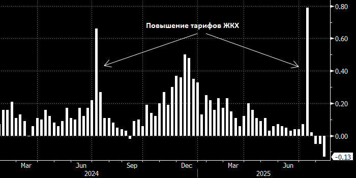 На неделе до 4 августа потребительская инфляция в России составила -0,13% н/н, сообщает Росстат. Это самое низкое значение с сентября 2022 года. Потребительская инфляция в России в базисе неделя к неделе На неделе до 4 августа потребительская инфляция в России составила -0,13% н/н (самое низкое значение с сентября 2022 года и третье дефляционное значение подряд), сообщает Росстат. С начала года накопленный показатель составил 4,37%. Годовая инфляция в РФ, по оценкам Минэкономразвития, замедлилась на неделе до 4 августа до 8,77% с 9,02% неделей ранее. «За период с 29 июля по 4 августа 2025 г. цены изменились: на свинину +0,6%, пшено +0,3%, консервы мясные и смеси сухие молочные для детского питания, крупу гречневую +0,2%, рыбу мороженую, масло подсолнечное, маргарин, творог, сыры твердые, полутвердые и мягкие, муку пшеничную, хлеб, водку, обеды в столовой, кафе, закусочной (кроме столовой в организации) +0,1%», — говорится в отчете Росстата. —«Цены на плодоовощную продукцию в среднем сн