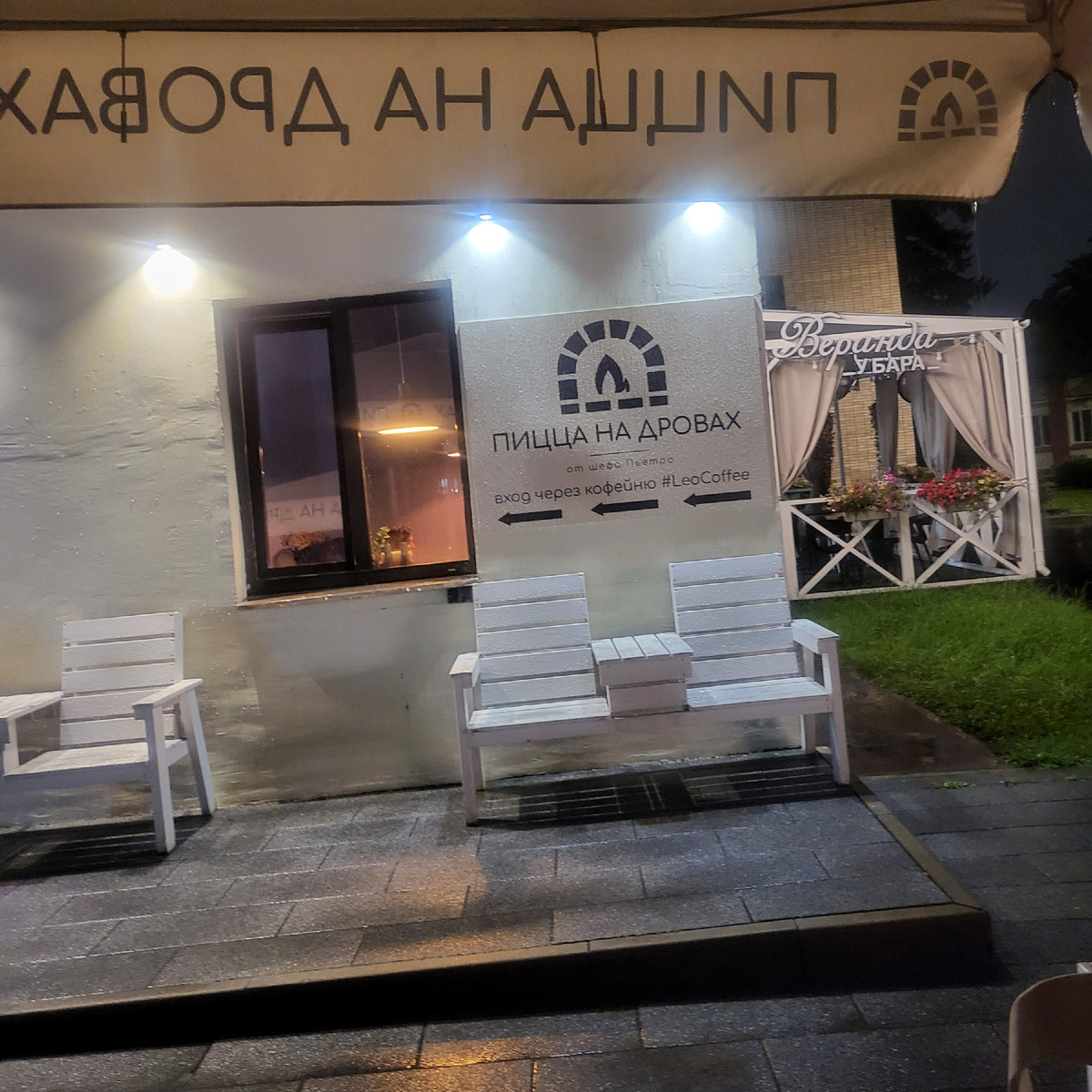 Пиццерия «Пицца на дровах» существует в симбиозе с кофейней #LeoCoffee: у них одна веранда, один вход, что их роднит - не знаю, где проходит между ними граница - тоже не совсем понятно, да это и не особо важно. Внутри несколько маленьких зальчиков, в самом дальнем и расположена дровяная печь, в которой и делают пиццу на дровах.