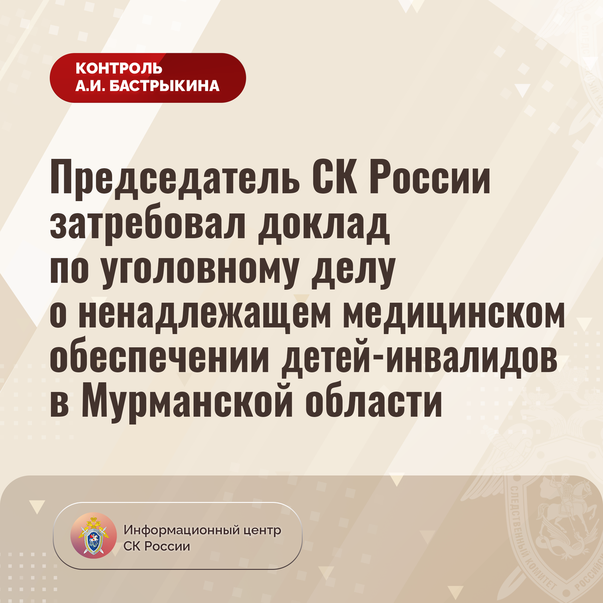 Председатель СК России затребовал доклад по уголовному делу о ненадлежащем медицинском обеспечении детей-инвалидов в Мурманской области В комментариях в аккаунте приёмной Председателя СК России А.И. Бастрыкина «ВКонтакте» поступили обращения по вопросу нарушения прав детей-инвалидов из Мурманской области на качественное медицинское обеспечение. На протяжении нескольких месяцев несовершеннолетним, страдающим сахарным диабетом, не предоставляются жизненно необходимые лекарственные препараты и медицинские изделия. При этом семьям предложено получение более дешевых аналогов расходных материалов, которые могут привести к ухудшению состояния здоровья детей. Обращения родителей в различные инстанции результатов не приносят. В СУ СК России по Мурманской области возбуждено уголовное дело. Председатель Следственного комитета Российской Федерации Александр Иванович Бастрыкин затребовал у и.о. руководителя СУ СК России по Мурманской области Федора Алексеевича Блюденова доклад о предварительных и о