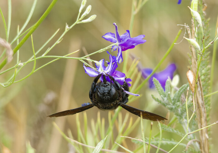 Пчела-плотник. Красная книга ЛНР. Статус. 3 категория - Редкий вид. Впервые я это чудо-чудное и диво-дивное увидел ещё в 2017 году. И долго пучил глаза от удивления. Начал копать что по чём. Каким-то чудом нашёл инфу, потому что первая фото была так себе. Параллельно, в процессе поиска, нашёл электронную версию Красной Книги ЛНР. Оказалось, что пчела, к сожалению, редкая в наших краях. Она гигантская, пипец. Самки до 3.5 см вырастает. Зато не злая. Жужжит себе и жужжит. За два похода к живановскому ставку видел её 4 раза. В других местах мне везёт не так часто. Или, что более вероятно, возле пруда до сих пор много цветущих растений. Поэтому все пчёлы туда и слетелись. Антрацит, ЛНР. Август 2025. Подписаться на Пикабу Познавательный. и Пикабу: Истории из жизни.