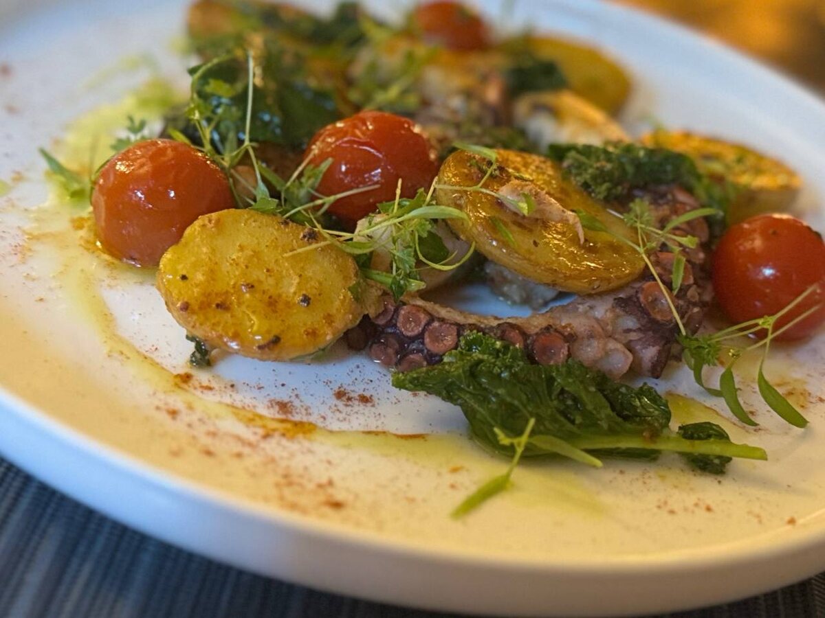 Аромат моря, смешанный с дымком костра, витал в воздухе. На столе, словно драгоценный камень, красовался осьминог, искусно приготовленный с молодым картофелем и томатами черри. Блюдо, вобравшее в себя солнце Средиземноморья и свежесть летнего бриза.