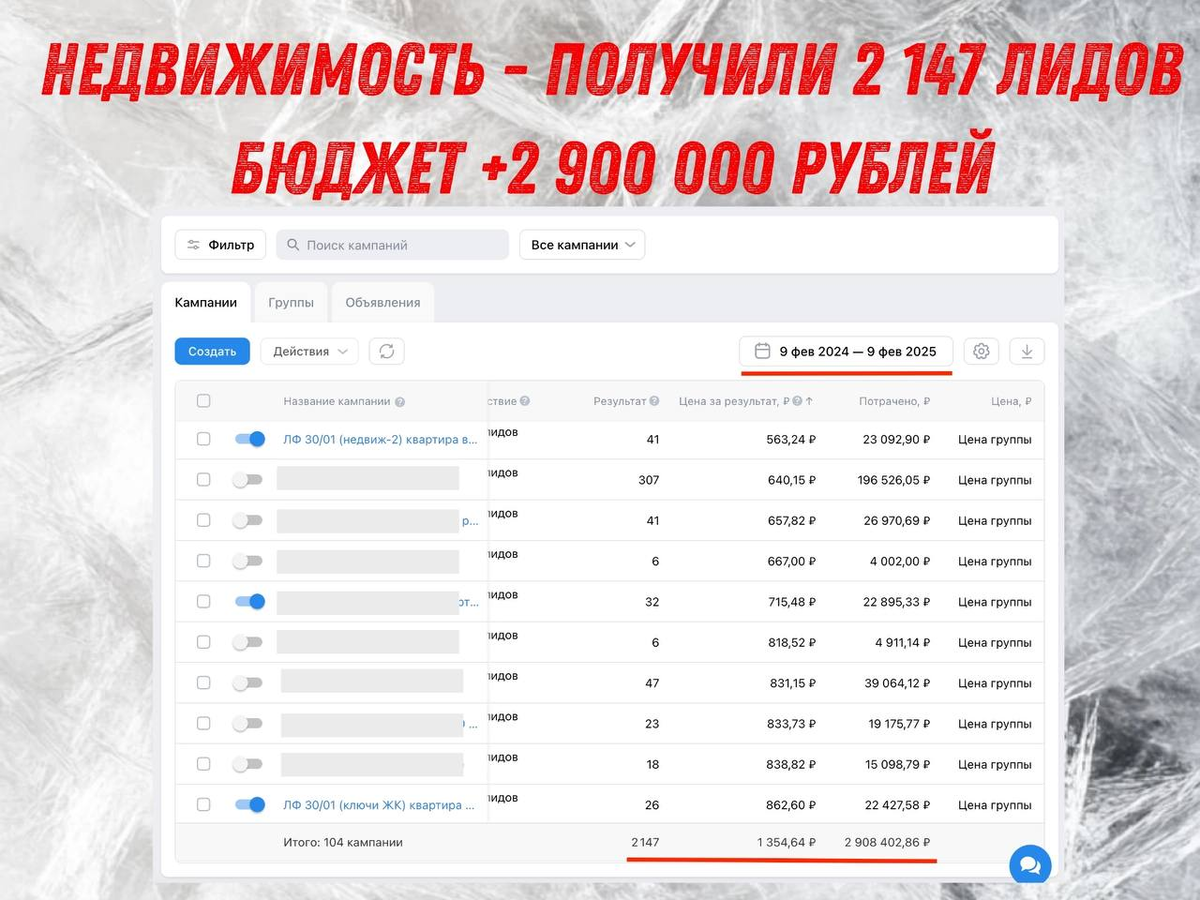 На самом деле там бюджет более 3 000 000 рублей и лидов еще больше. Просто Вк не дает статистику закрутить более чем за год, а с этим клиентом я работаю с 2023 года, поэтому цифры такие.