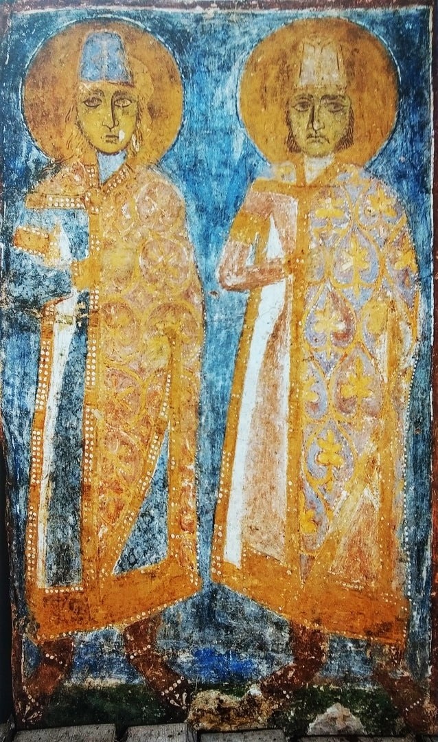 Борис и Глеб. Фреска Спасской церкви Евфросиньевого монастыря, XII в.