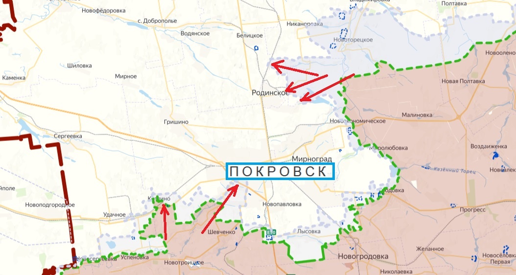 Мы с вами за последние месяцы привыкли к такому - как только наши подходят к очередному городу, то вместо того, чтобы ломиться в лоб, мы его методично охватываем, берём в клещи. Причём, один умный человек с линии соприкосновения пояснил: в клещи берётся прежде всего для того, чтобы нарушить логистику, а уже потом вынудить выйти из города его гарнизон. Оказалось, что при нарушенной логистике с той стороны потери такие, что хватило бы на два гарнизона ещё. При всём при этом мы своих людей не тратим, за них всё делают беспилотники. Прямо сейчас точь-в-точь сформирована такая же ситуация вот здесь: В настоящий момент мы очень плотно контролируем 2 из 3-х дорог в город, хотя клещи далеки от окончательного оформления. Мы уже сообщали, что 2-3 транспортных средства из 5 попадают под наши удары. Уже сейчас противник ноет, что город обречён, осталось узнать лишь точный день. Кстати, сейчас с той стороны спешно пытаются закинуть сюда новые силы (в том числе недавно отловленных), чтобы этот день