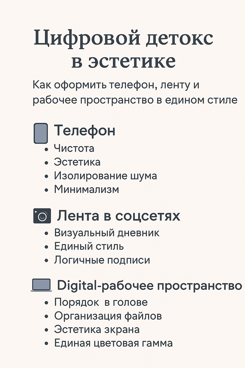 Телефон — это продолжение нашего внутреннего состояния. Начнем с него. Ваш Instagram или Pinterest может стать местом вдохновения, а не прокрастинации. Рабочий стол на компьютере, файлы и заметки тоже влияют на ощущение загруженности. Цифровая эстетика — не про внешний лоск. Это способ создать визуальное спокойствие, минимизировать раздражители и поддерживать внутренний порядок через внешний. Ваша digital-среда — это ваш второй дом. Пусть она будет лёгкой, тёплой и