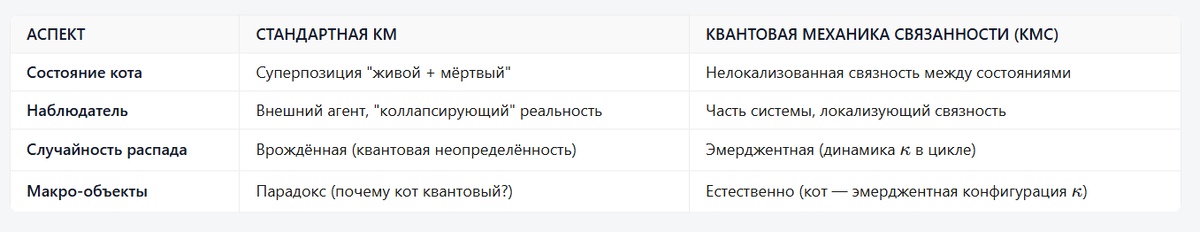 В КМС нет суперпозиции, нет коллапса, нет "особого" наблюдателя. Вот что происходит: КМС предсказывает: Если усилить связность между котом и атомом (κ→1), состояние кота станет детерминированным ещё до наблюдения. Как проверить: Философский вывод:
