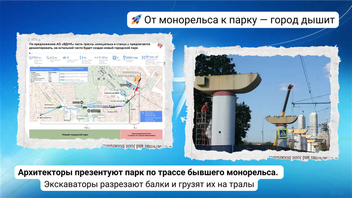 В раннем выпуске за 13 августа 2025 года, по традиции, обсуждаются актуальные аспекты развития комплексной инфраструктуры Москвы (КИМ). Мы снова рассказываем просто о том, как меняется наш город и что это значит для нас с вами. На этот раз поговорим о бывшем монорельсе, посмотрим на процесс его демонтажа, и оценим перспективный парк, возводимый вместо данного вида транспорта. А вы как считаете? Заметны ли изменения в вашем районе? Пишите в комментариях, обсудим. Ваше мнение для нас важно не меньше, чем официальные отчеты. Давайте вместе разберемся, что же на самом деле происходит с нашей Москвой. Поехали? Во-первых, покажем презентацию будущего парка на инфраструктуре бывшего 🚝 Московского монорельса. Во-вторых, сообщаем вам, что продолжается демонтаж и вывоз балок 🚝 Московского монорельса. ----------------------------------------------------------------------------------- Ну вот, друзья, мы и добрались до финала нашего раннего мини-репортажа. Знаете, мы тут в редакции немного пережи