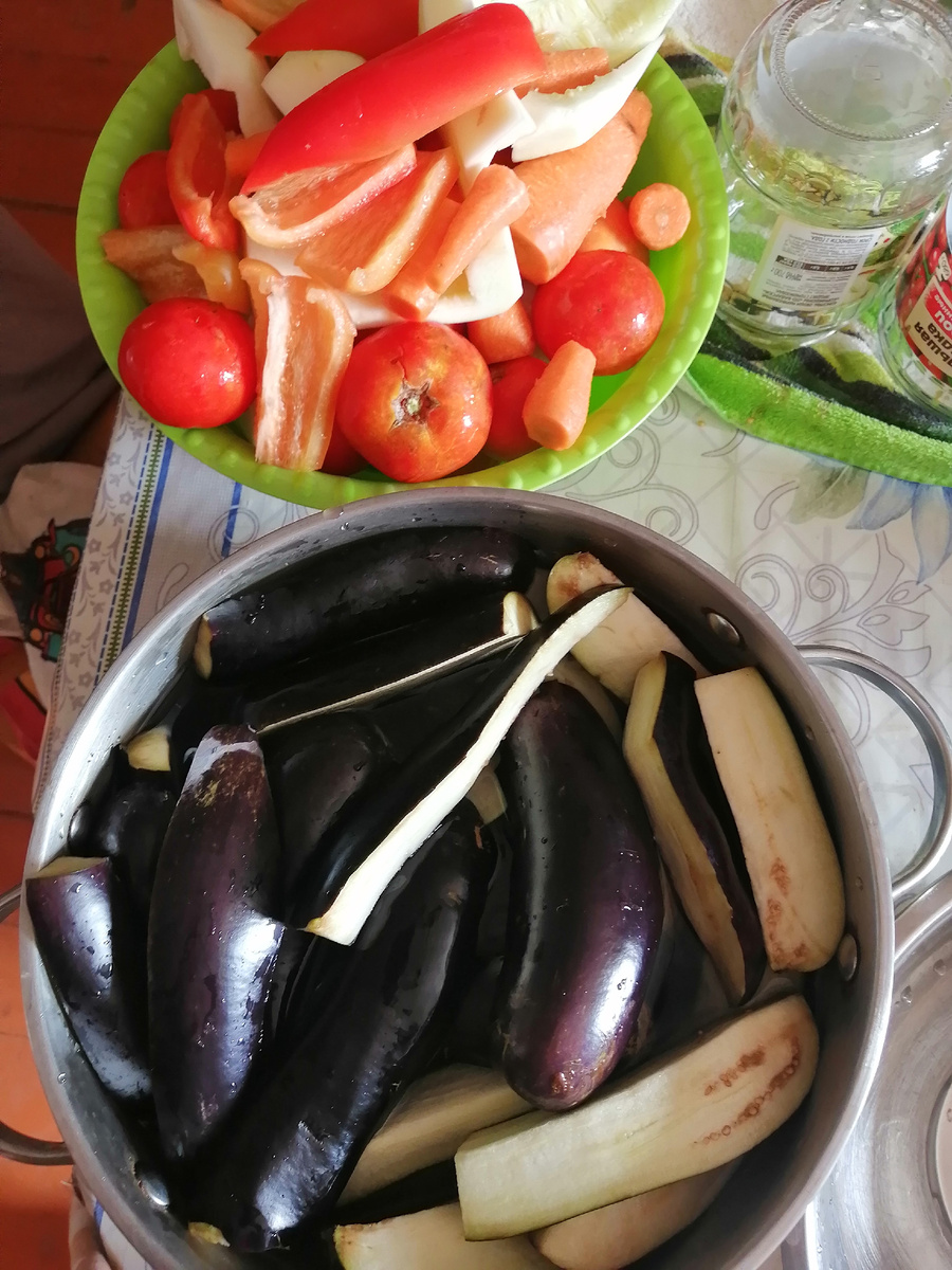 Доброго времени суток , уважаемые читатели! Сегодня денек был насыщенный. С утра закатала баночку , икру баклажанную сделала и помидоры две банки закрыла . Провозилась с закрутками до обеда. Вроде и сделала немного, а время ушло много. Пока все перекрутила , пока тушила , стерилизовала , потом помидоры три раза заливала , пока все перемыла , время обед. В обед немного отдохнула. Баклажанная икра вкусная получилась. С утра замариновала мясо. Я ела мало совсем , у меня своя еда . А мариновали мясо так , добавила приправу , гранатовый уксус и помидоры с луком . Получилось вкусно. Еще готовили рыбку. Мариновали тоже помидором, луком и лимоном На ужин нас позвали отдыхающие , они 8 утром уезжают , вот как бы в честь этого ужин. Пока ужин готовился , меня муж отвез в магазин. Купила себе бананы на перекус, в них много калия при гипертонии очень полезно их есть. Я себе фонарик купила. И форму для запекания. Костюм там продавался такой симпатичный шорты и футболка, хотела купить , а муж