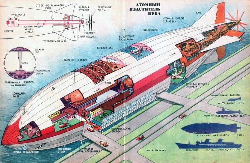 🎈 Этот неосуществленный проект был разработан в СССР в 1970-е. Заполненный гелием гигант получал энергию от реактора с жидкометаллическим теплоносителем (литием) мощностью 200 МВт. Горячий жидкий литий направлялся в теплообменник, где отдавал тепло рабочему газу, который, раскручивал турбовинтовой двигатель с винтами диаметром 20 метров. Атомный дирижабль мог бы перевозить до 1800 человек! На борту имелся даже ангар для самолета и вертолета, что позволило бы осуществлять посадку и высадку пассажиров без приземления дирижабля. 🚀 Летные характеристики: Грузоподъемность - 150-180 тонн Скорость - от 200 до 300 км/ч Длина корабля - 300 м, диаметр 50-60 м. Подписывайся на наш телеграмм канал, совсем скоро начнется розыгрыш с крутыми призами 🎁😉 t.me/dumai_russia